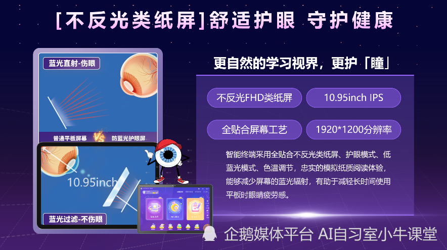 智能终端采用全贴合不反光类纸屏、护眼模式、低蓝光模式、色温调节,忠实的模拟纸质阅读体验,有效减少屏幕的蓝光辐射,减轻用眼疲劳。