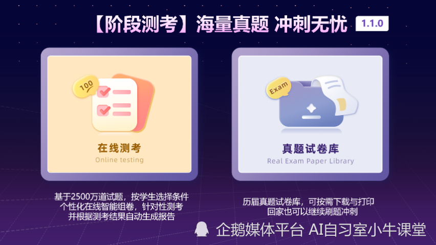 结合庞大的教育题库+本地考点难点资源,通过导航式测评,及时发现薄弱环节,优化学习路径。个性化智能组卷→海量试卷真题/课本原题→针对性测考→测考报告,全流程诊断,突破薄弱环节。