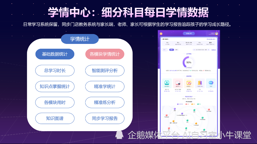 牛童学门店教务系统:学员自习学情清晰掌握,提供教务数据、财务数据等数据支持,更有效督学,更轻松运营。