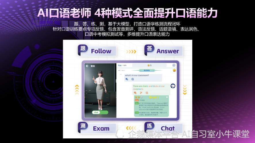 基于大模型,打造跟、答、练、测四大口语学练测流程闭环。针对口语训练要点专项反馈,设立发音测评、语法反馈、话题语境、表达润色、口语中考模拟测试等学习模块,多维提升口语表达能力,让英语不再开口难。