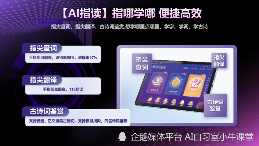 灵敏的触屏学习体验,支持指尖查词、指尖翻译、古诗词鉴赏,点指之间,一键强化,想学哪里点哪里。